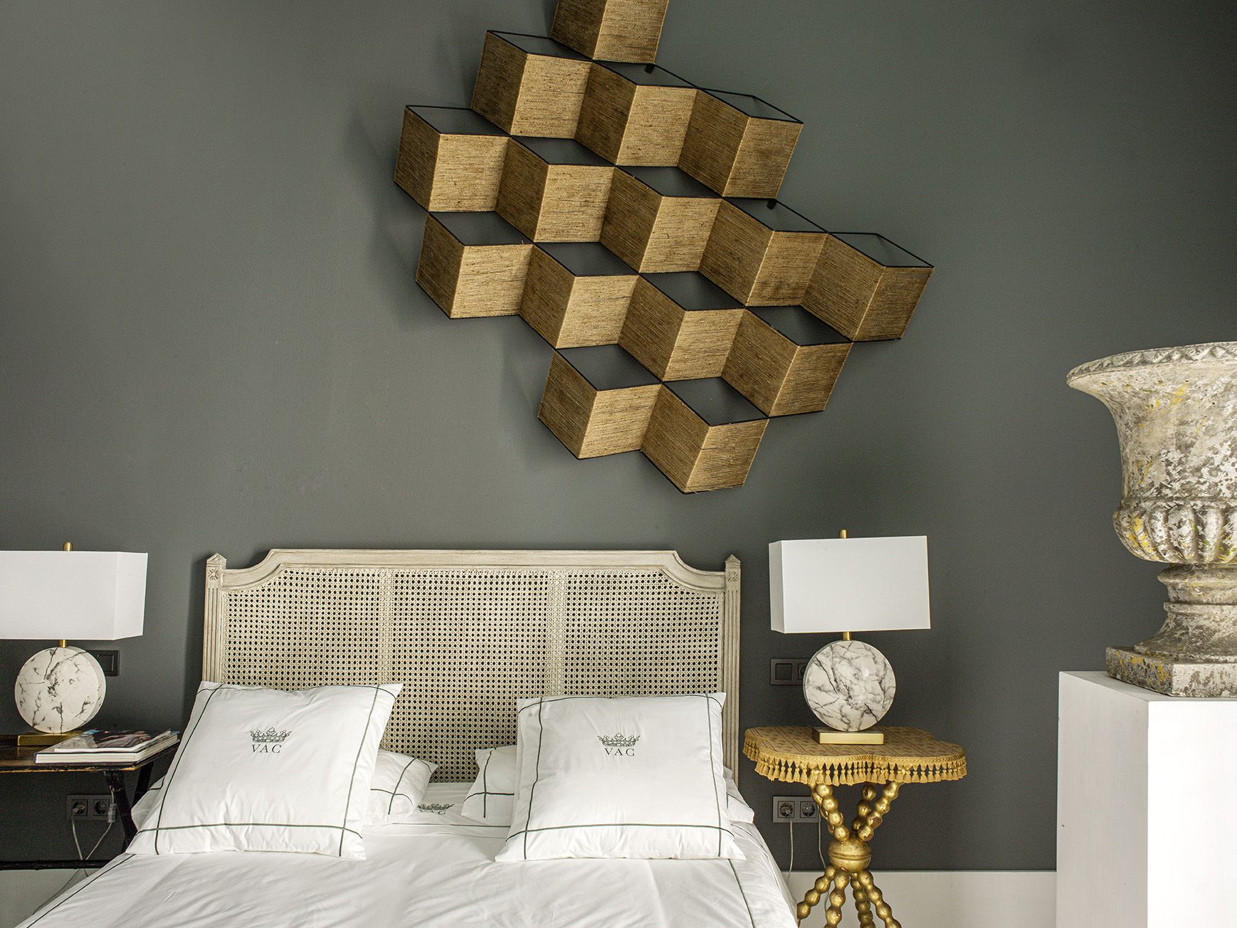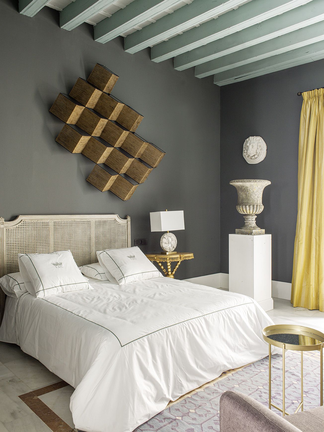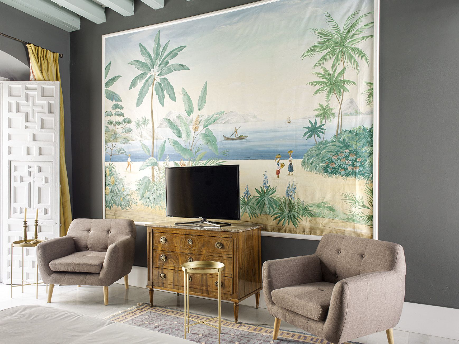 Suite de 28 m2, en la planta primera. Hemos aprovechado el antiguo salón de la casa para poner un lienzo del pintor Dugimont que representa unas playas de Tahití con pescadores que da mucha profundidad a la pared principal del cuarto. A destacar su balcón exterior y sus techos con artesonado de 4 metros de altura, acceso con un tramo doble de escaleras.