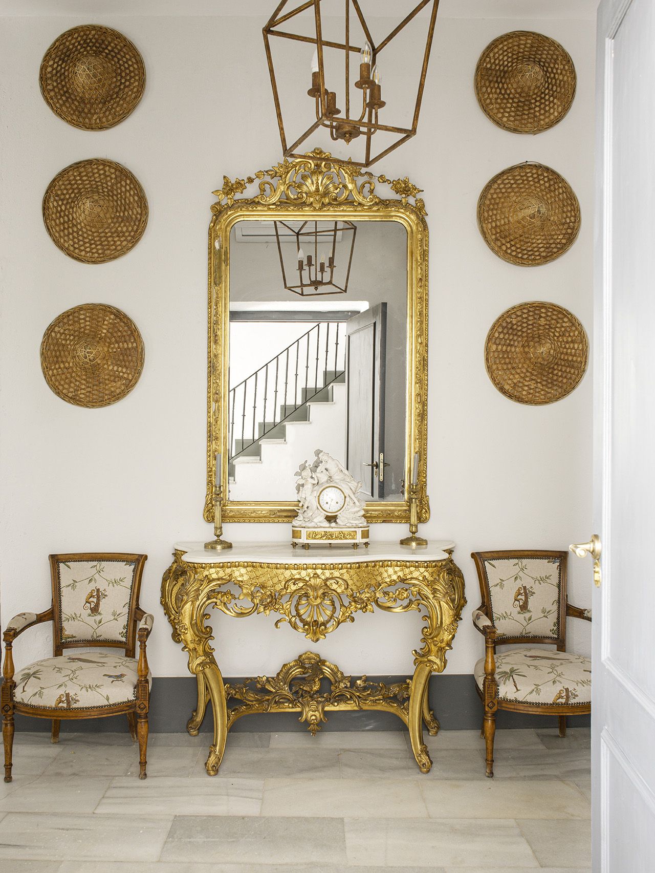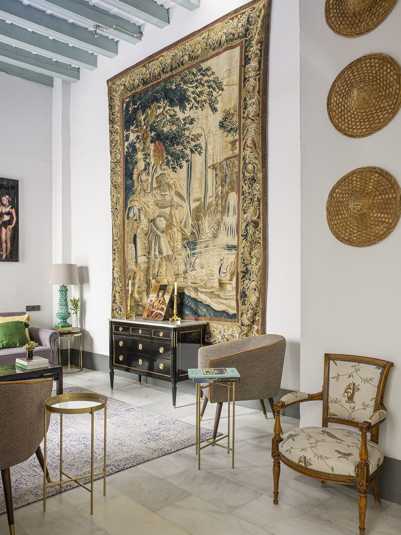 Suite de 30 m2, planta baja, zona de estar, techos con artesonado de 4,5 metros de altura, acceso sin escaleras. Este cuarto destaca por su amplitud y comodidad, al estar ubicado en la Planta Baja, con acceso directo al patio. Su altura de techos nos ha permitido poner en valor la pieza principal del cuarto, un tapiz flamenco de lana del siglo XVII representando a Odiseo y Ajax en el funeral de Aquiles, que acompañamos de fotografías modernas y mobiliario francés y español de los siglos XVIII y XIX.