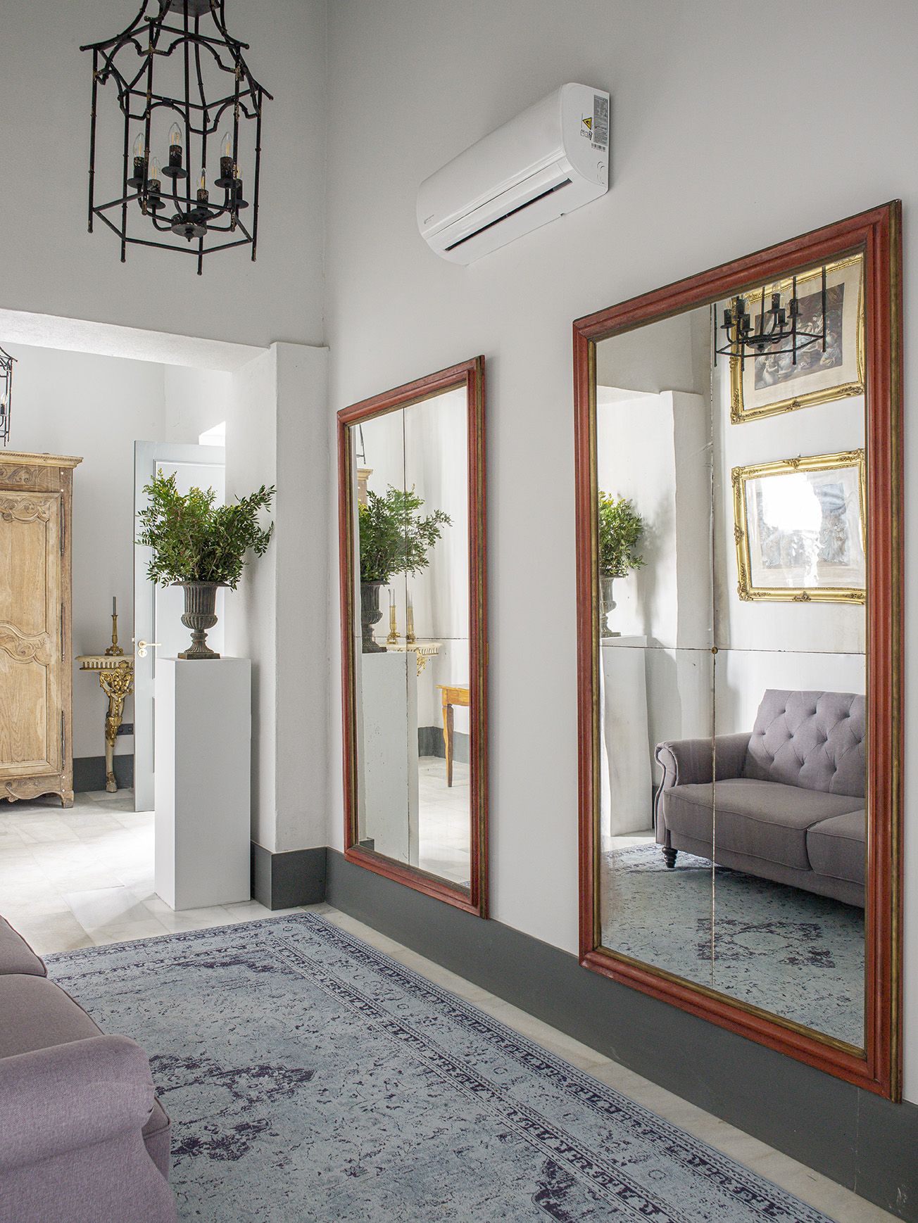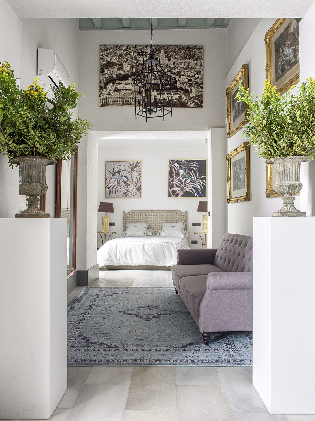 Suite de 40 m2, la más grande de toda la casa. Comodidad de acceso al estar en la planta baja, con acceso directo al patio. Consta de zona de estar, vestidor y gran cuarto de baño, techos con artesonado de 4,5 metros de altura. Sus grabados del S XIX destacan en la zona de salón.